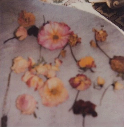 And memory is at the heart of these photographs. They span 55 years, from the early photographs of Robert Rauschenberg’s Combine Material in the Fulton Street studio – cloth, wood, and detritus heaped, piled, and stacked in anticipation – to moments of sky, a cloud touched by pink and grey, taken just a few months before his death. His photographs of bouquets of flowers left on a grave, Polaroid lilies and roses, are particular to a moment of privacy staged in public. The flowers, poignant in their extravagance, become a kind of testimony. In the image of a yard sale in Lexington – a jumbled collection of abandoned objects, a watermelon, a jar of marbles, kitchen implements – objects become as memorialised as Homer’s thousand ships.