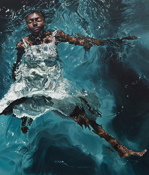A Dream for My Lilith expands on the legacy of Lilith, the mythological figure deemed the first wife of Adam, towards the notion of liberation and strength held in the bodies of black women and girls. Lilith is repositioned from a malevolent spirit at the antithesis of womanhood to a sovereign being who drifts in a realm of therapeutic possibilities. Influenced by contemporary black writers, like Claudia Rankine and Roxane Gay, and their approach to intersectionality, Rawles creates expansive visions of serenity in today’s turbulent times. Insisting upon the triumph of humanity, while also contending with anti-black violence/trauma, Rawles allows for Lilith to surface as a source of inspired rebellion. Floating on ripples of cerulean and washes of deep cavernous blue, Rawles’ portraits envision black women in gowns of ivory floating in masses of unnamed water that nearly exceed the curb of the canvas. This non-place of water harbors moments of leisure and sensual delight along with spiritual relief and kinship. Water, with its historical connection to black suffering through Middle Passage and Jim Crow legislation, is also the architect of black serenity in escape and spiritual cleansing and is everpresent in Rawles’ paintings. Strokes of acrylic create textures of deep movement where figures sink and float within the canvas surface. At the same time, their gestures suggest the possibilities of peace in the face of uncertain bodies of water. Rawles works towards the allegorical potential of water and its boundless pursuits offering a new space for black healing.